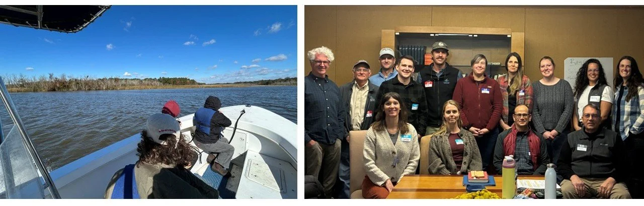 Left: Graduate students from the University of Michigan School for Environment and Sustainability join Matt Pluta, Choptank Riverkeeper, for a day on the water to ground-truth their research on tidal wetland adaptation. Right: Envision partners participate in a learning exchange with colleagues at Lancaster Clean Water Partners to share knowledge and experience around agricultural technical assistance and collaborative work.