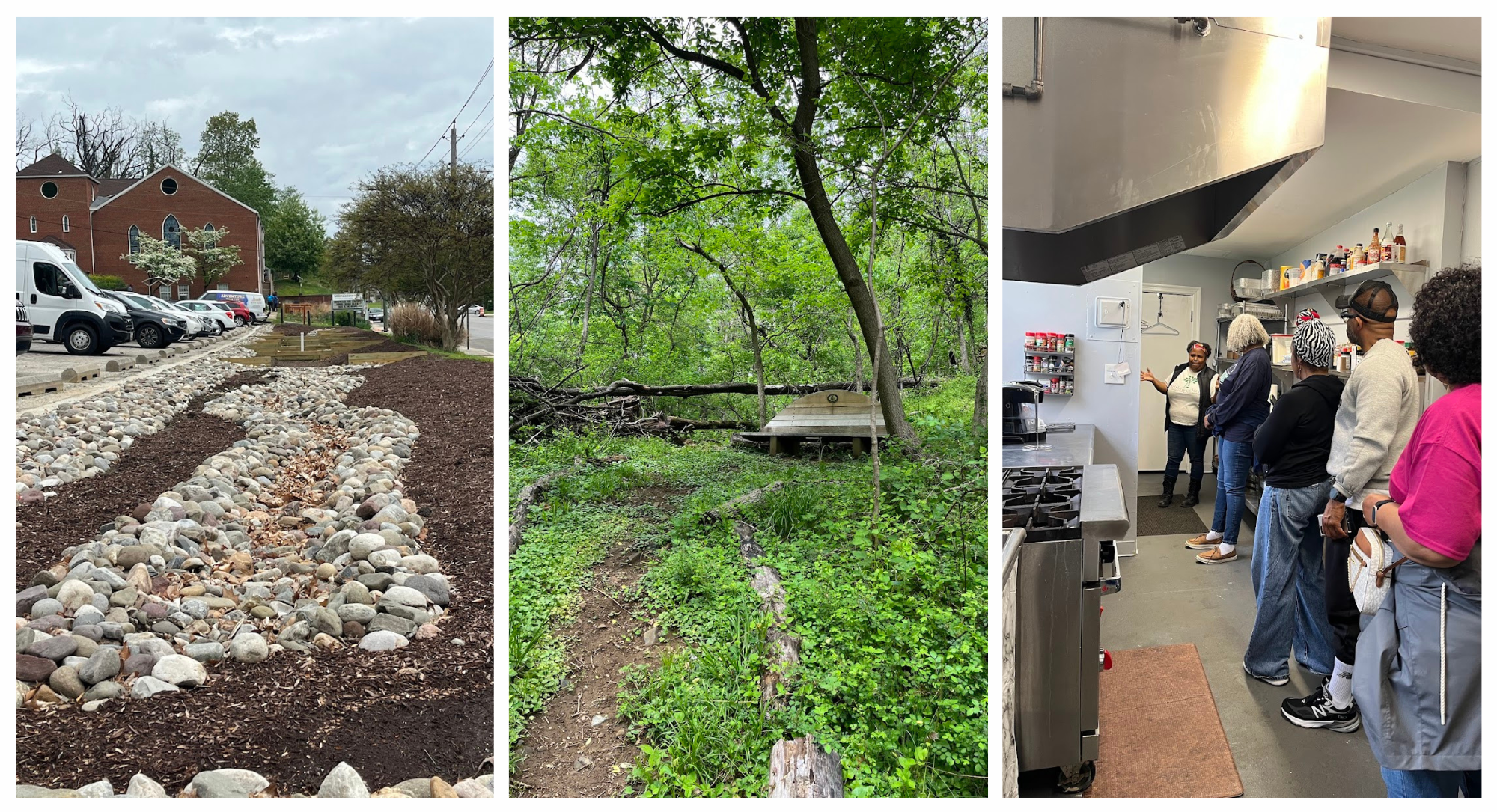 LEAD 2.0 participants toured Stillmeadow Community Fellowship’s stormwater restoration project (left), Peace Park (center), and resilience hub, which includes a commercial kitchen for community use (right). Photos by Hilary Gibson